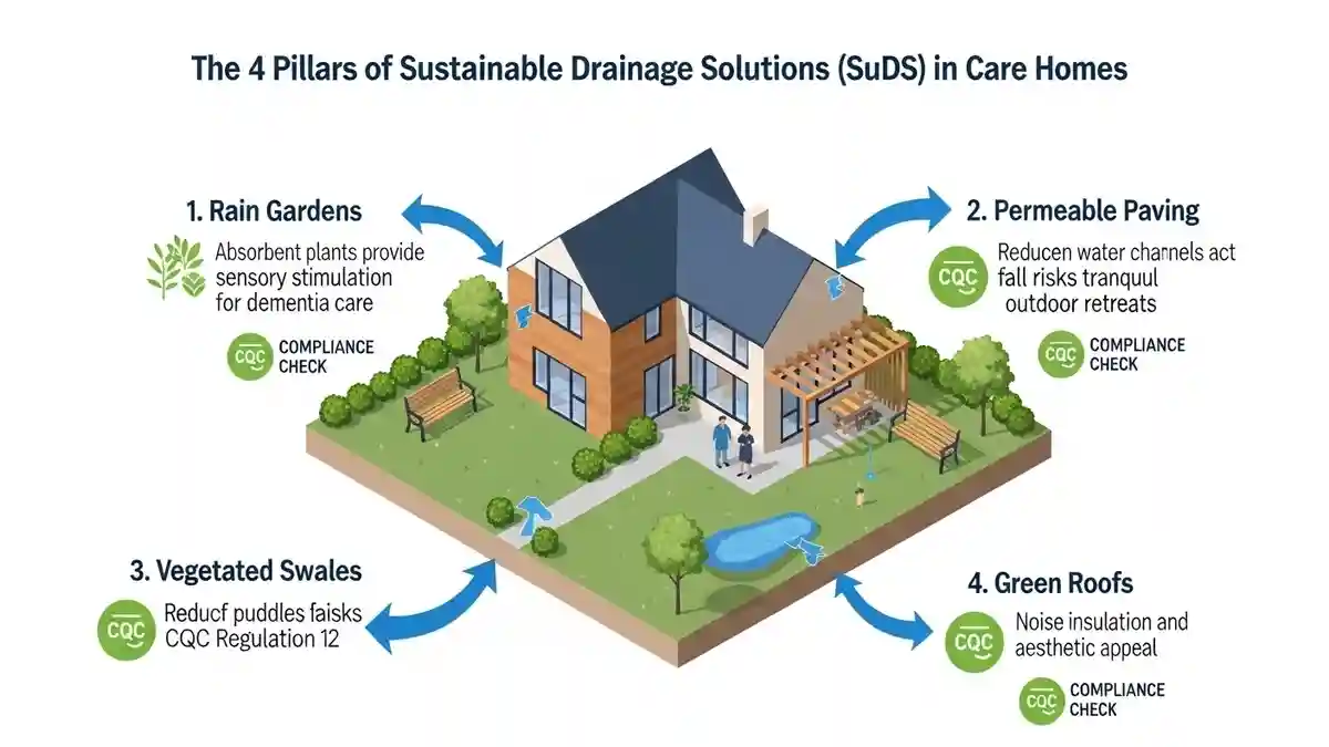 The future of sustainable drainage solutions CQC care home design is the integration of SuDS (Sustainable Drainage Systems). In Cliddesden, Policy EN18 of the Local Plan encourages SuDS to manage surface water runoff, which often plagues the surrounding area.